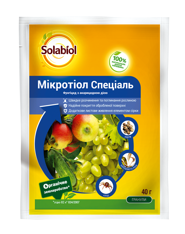 Мікротіол Спеціаль - фунгіцид з акарицидною дією для застосування на плодових, овочевих культурах та винградниках. Це продукт європейського виробництва, зареєстрований в Європейському Союзі та в Україні для органічного господарства.